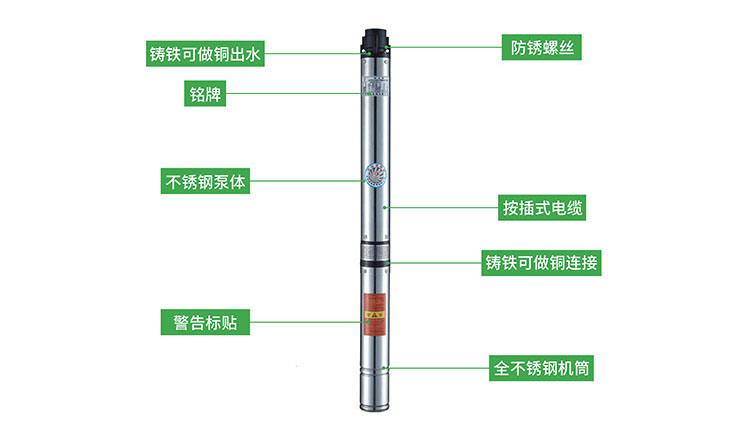 二、產(chǎn)品特點(diǎn)1、電機(jī)、水泵一體,潛入水中運(yùn)行,安全可靠。 2、對(duì)井管、揚(yáng)水管無(wú)特殊要求(即:鋼管井、灰管井、土井等均可使用;在壓力許可下、鋼管、膠管、塑料管等均可作揚(yáng)水管使用)。 3、安裝、使用、維護(hù)方便簡(jiǎn)單,占地面積小、不需建造泵房。 4、結(jié)構(gòu)簡(jiǎn)單、節(jié)省原材料。 潛水電泵使用的條件是否合適,管理得當(dāng)與使用壽命有直接的關(guān)系。