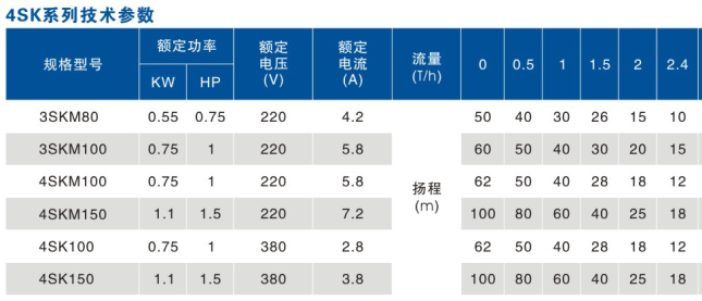 4SK旋渦式深井泵井用潛水泵性能參數(shù):