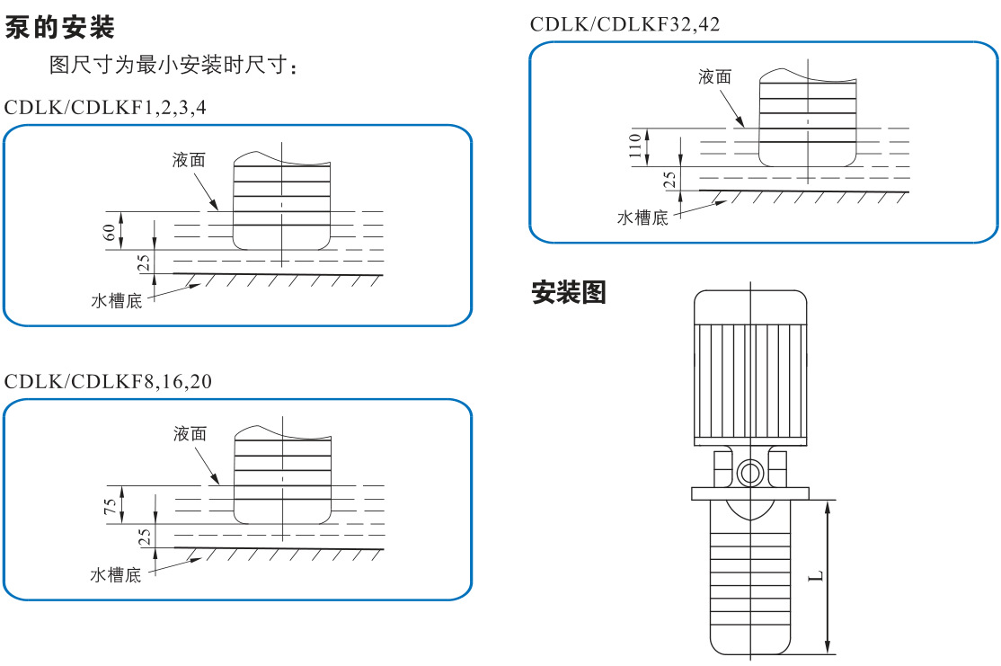CDLK/CDLKF為安裝標(biāo)準(zhǔn)電機(jī)的非自吸立式多級(jí)離心泵,電機(jī)軸通過泵頭用聯(lián)軸器直接與泵軸聯(lián)接,泵可根據(jù)需要配置智能保護(hù)器,對(duì)泵干轉(zhuǎn)缺相、過載等進(jìn)行有效保護(hù)。為滿足水槽或容器的安裝深度,可安裝空腔體來改變泵本身的長度,不同的級(jí)數(shù)長度見尺寸和重量表和可供產(chǎn)品范圍表。