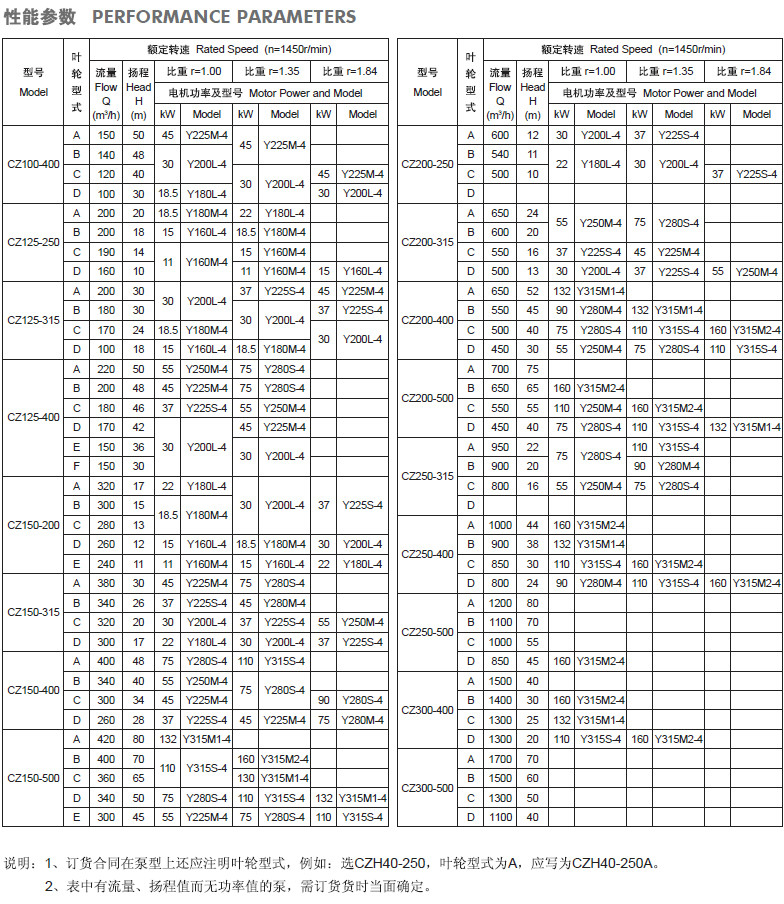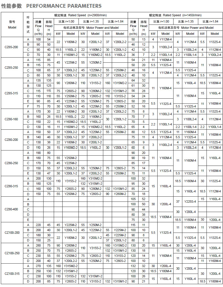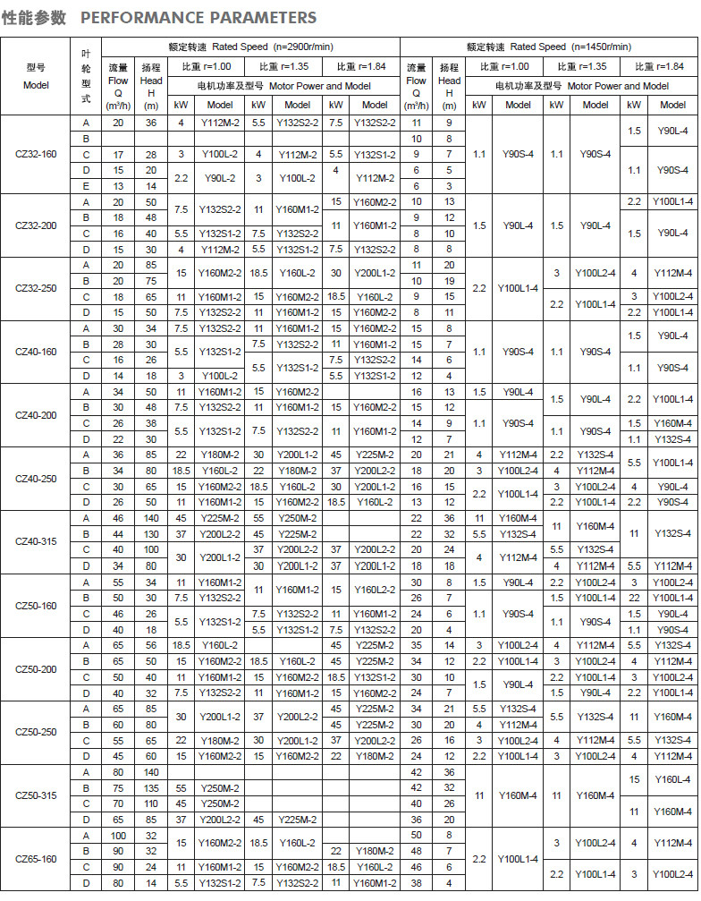 CZ標(biāo)準(zhǔn)化工泵性能參數(shù):