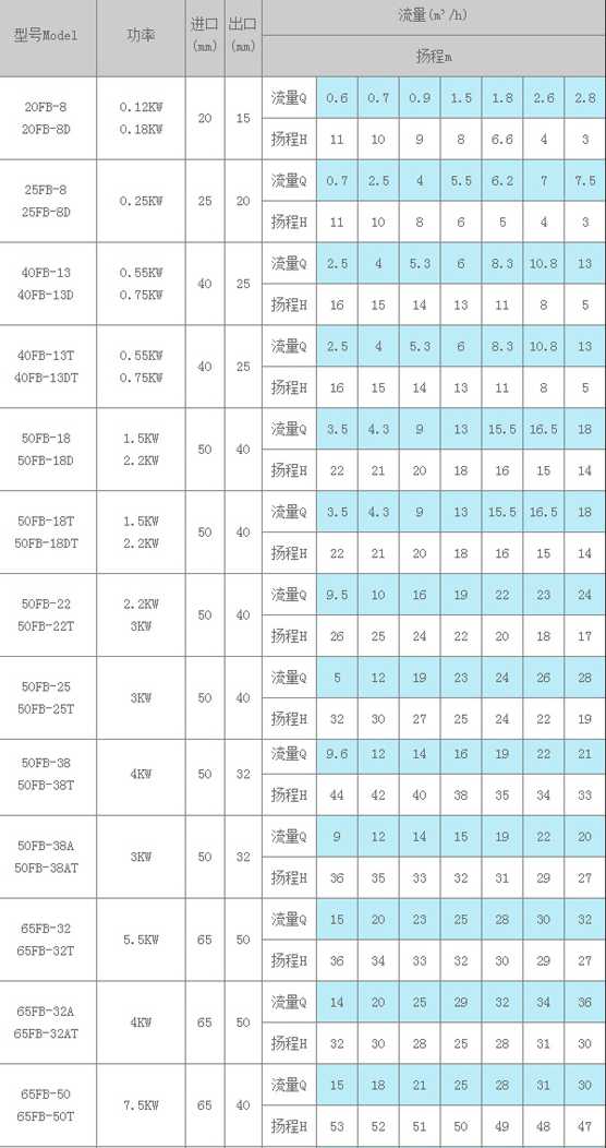 FB、AFB型耐腐蝕泵性能參數(shù):