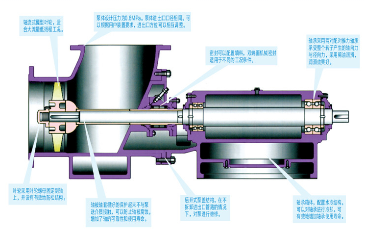 泵體、葉輪、后蓋、軸封箱、軸套、軸保護(hù)套、節(jié)流環(huán)、葉輪罩等過流件主要材料采用