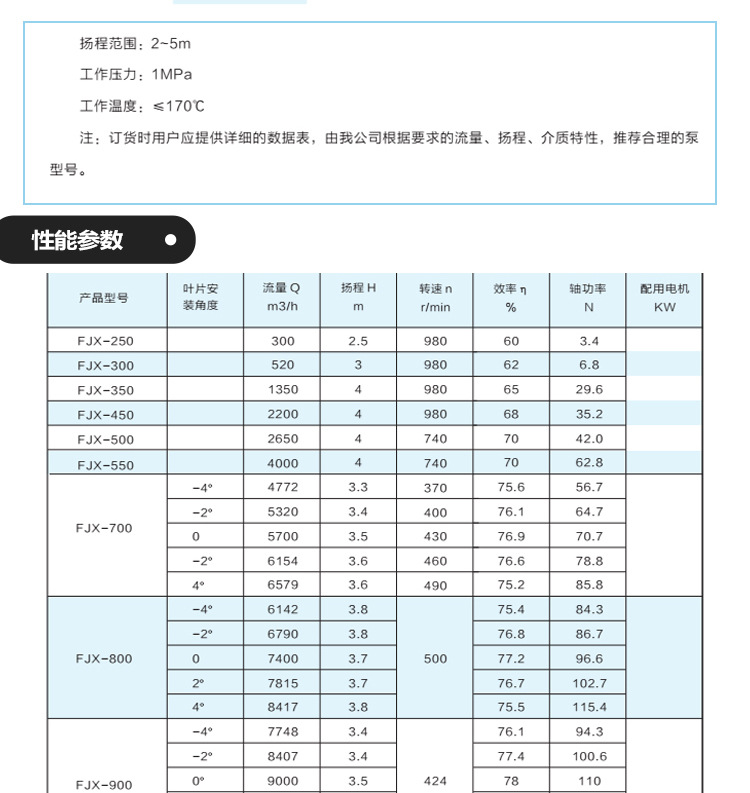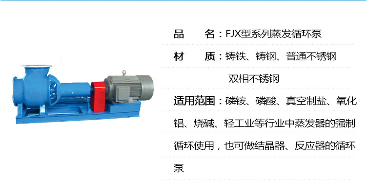 FJⅩ型系列蒸發(fā)循環(huán)泵為大流量、低揚(yáng)程軸流泵,專供磷銨、磷酸、真空制鹽、氧化鋁、燒堿、輕工等行業(yè)中蒸發(fā)器的強(qiáng)制循環(huán)用,也可作結(jié)晶器、反應(yīng)器的循環(huán)泵。
