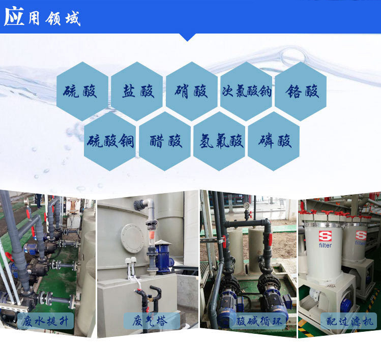 廣泛應(yīng)用于化工、食品、釀造、制藥、電鍍、造紙、環(huán)保、水 處理等部門,輸送酸、堿、鹽等腐蝕性液體。