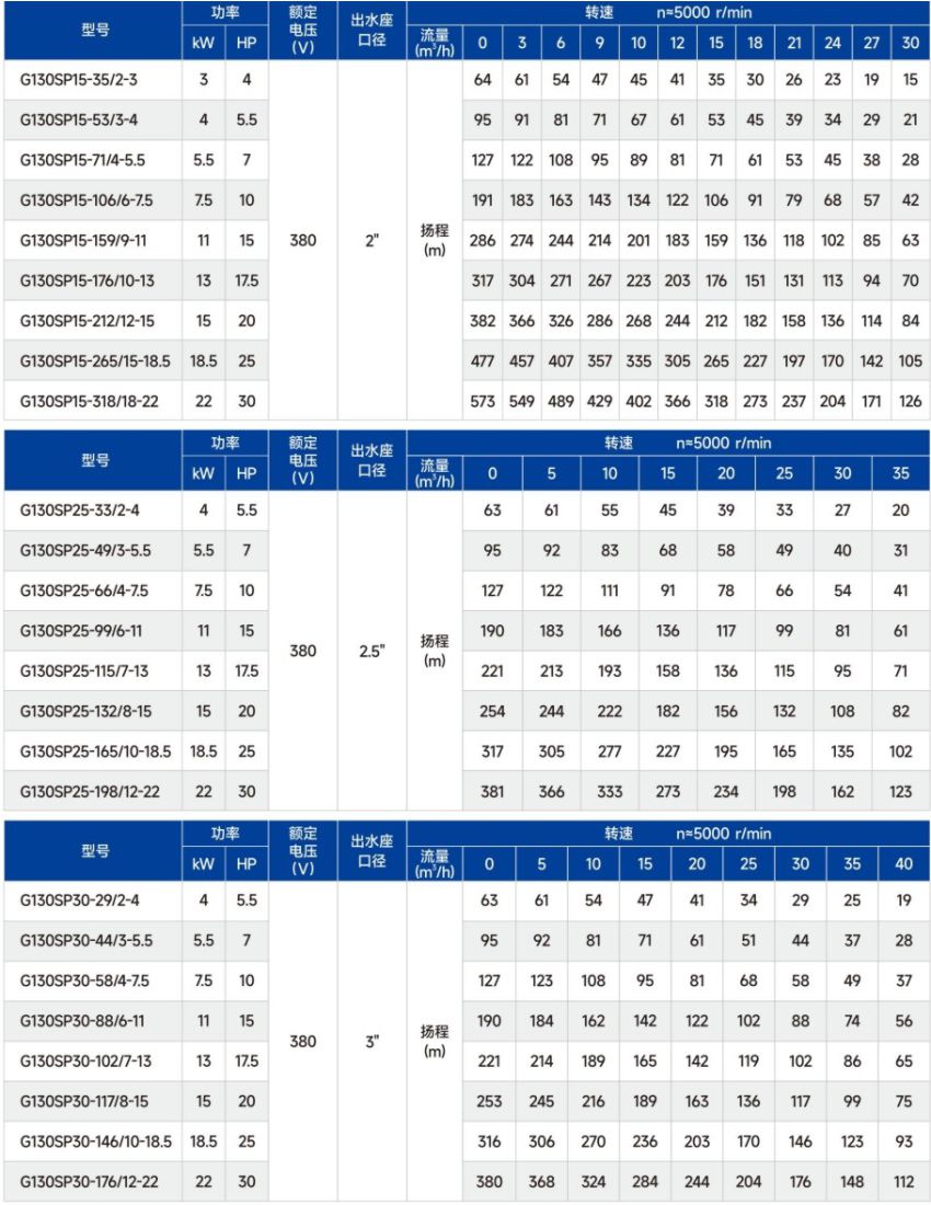 G130SP系列高速高效節(jié)能深井泵性能參數(shù):