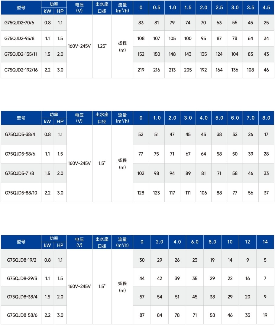 G75QJD系列高速高效節(jié)能深井泵性能參數(shù):
