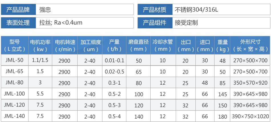 JML立式膠體磨-衛(wèi)生級(jí)性能參數(shù):