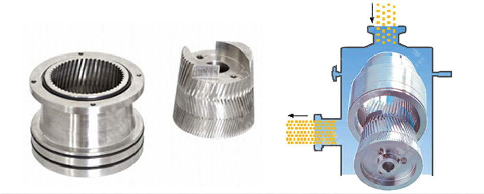 1.不銹鋼轉(zhuǎn)、定子高速研磨,其中一個(gè)高速旋轉(zhuǎn),另一個(gè)靜止使通過(guò)齒形斜面之間的物料受到極大的剪切力和摩擦力。
