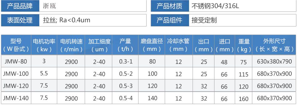 JMW臥式膠體磨-衛(wèi)生級(jí)性能參數(shù):