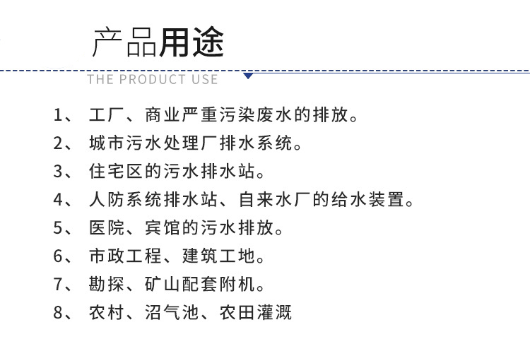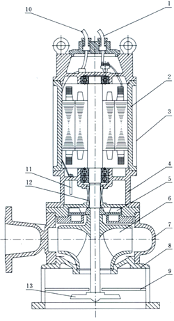 結(jié)構(gòu)特點(diǎn)說(shuō)明 1、采用獨(dú)特的雙流道無(wú)堵塞葉輪結(jié)構(gòu),提高污水污物的過(guò)流能力和排污能力。 2、自動(dòng)攪拌裝置,產(chǎn)生極強(qiáng)的攪拌力,將池內(nèi)的沉淀物攪拌成懸浮物后吸入葉輪排出,達(dá)到清淤的作用。 3、隔板將底座一分為二,攪拌與進(jìn)水互不影響。 4、機(jī)械密封為雙端面機(jī)械密封,長(zhǎng)期處于油室中,保證水泵安全可靠地運(yùn)行。 5、副葉輪結(jié)構(gòu)的流體動(dòng)力密封,既有輔助密封作用,從而保護(hù)機(jī)械密封,又平衡軸向力,延長(zhǎng)軸承的使用壽命。 6、泵連線(xiàn)腔內(nèi)沒(méi)有漏水檢測(cè)探頭,出現(xiàn)漏水時(shí),探頭發(fā)出信號(hào),控制系統(tǒng)對(duì)泵實(shí)施保護(hù),本公司可配全自動(dòng)安全保護(hù)控制柜。 7、電機(jī)定子采用B級(jí)和F級(jí)絕緣,內(nèi)設(shè)熱保護(hù)器,當(dāng)電機(jī)過(guò)載發(fā)熱,保護(hù)器及時(shí)作出動(dòng)作,對(duì)泵和電機(jī)實(shí)施絕對(duì)的保護(hù)。 8、油室內(nèi)裝有油水探頭,當(dāng)機(jī)械密封損壞后,水進(jìn)入油室,探頭發(fā)出信號(hào)由控制系統(tǒng)對(duì)水泵實(shí)施保護(hù)。 9、JPWQ帶內(nèi)循環(huán)冷卻系統(tǒng),能保證水泵在水池低水位正常工作。