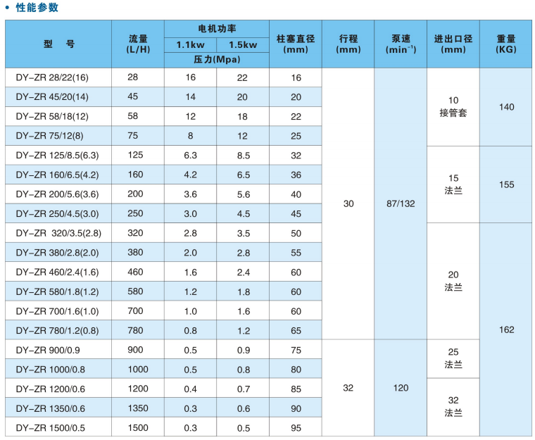 DY-ZR液壓隔膜式計(jì)量泵性能參數(shù):