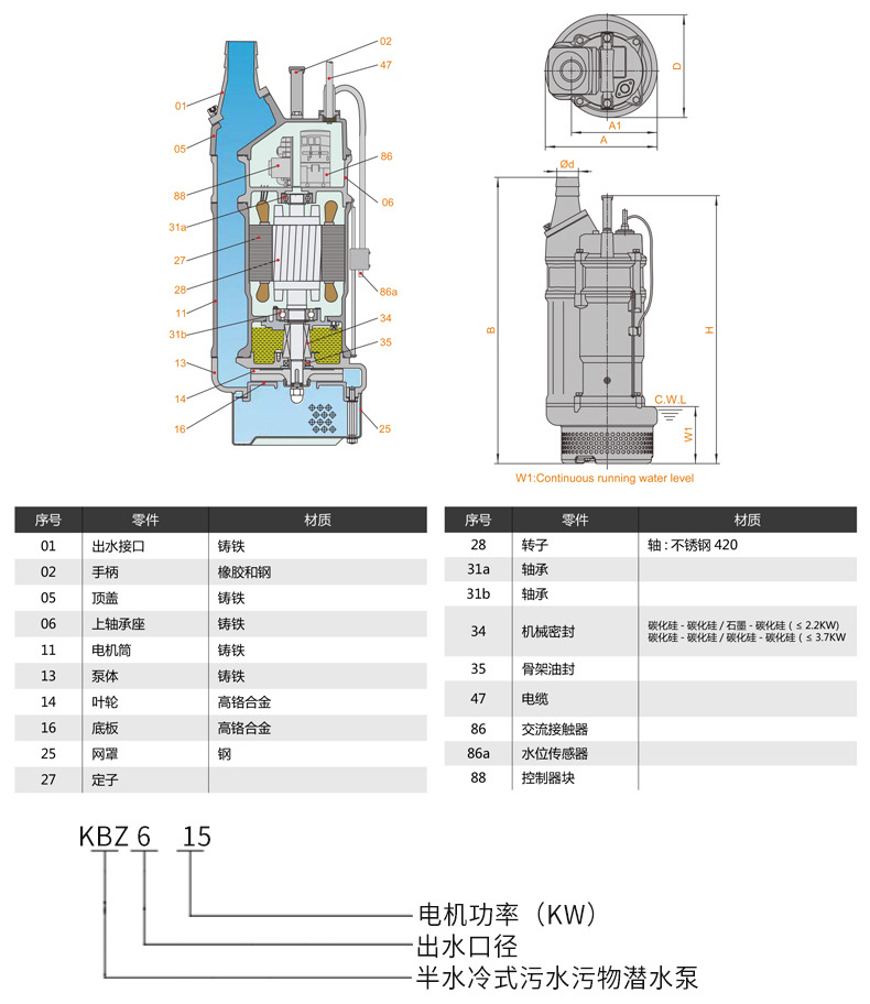 KBZ污水污物潛水電泵,它是電機與水泵同軸潛入水中工作的,該泵過流部件采用高合金耐磨材料制造,具有較好的耐磨性,過流通道大。該系列產品吸收國內外技術設計制造,獨特的密封裝置能夠很好的平衡油室內外壓力,很