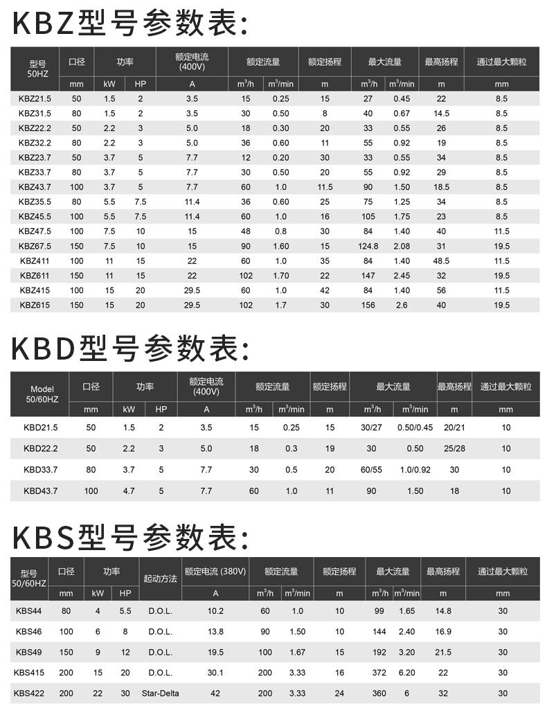 KBZ潛水渣漿泵耐磨抽沙泵性能參數: