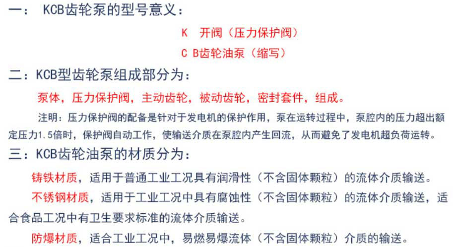 KCB齒輪泵不適用于輸送腐蝕性的、含硬質(zhì)顆?;蚶w維的、高度揮發(fā)或閃點低的液體,如苯等。(如該泵采用銅齒輪,可用于汽油;如該泵采用不銹鋼,可輸送一般腐蝕性液體。訂購時請說明!)