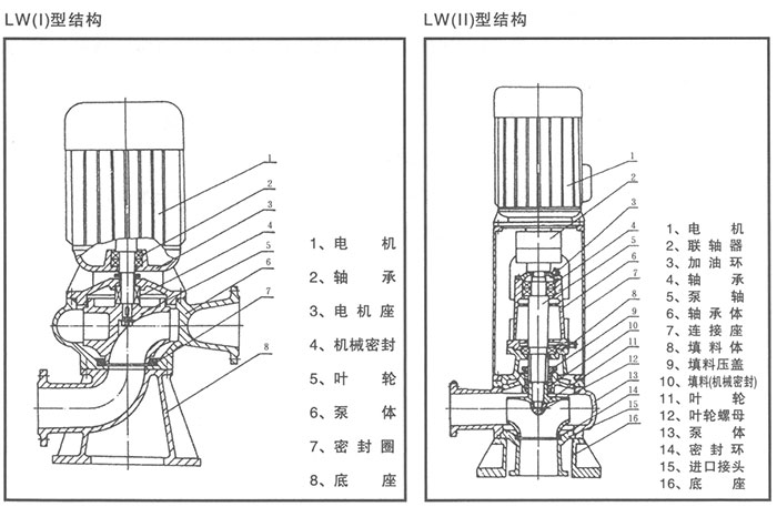 LW型系列立式無(wú)堵塞排污泵為單吸蝸殼式泵,泵內(nèi)裝有無(wú)堵塞防纏繞型單(雙)大流道葉輪,具有很好的通過能力。該系列泵具有兩種結(jié)構(gòu)形式,一是電機(jī)與泵直接同軸,二是采用聯(lián)軸器聯(lián)接,電機(jī)采用標(biāo)準(zhǔn)立式電機(jī)。其結(jié)構(gòu)圖如下,每種結(jié)構(gòu)形式具有兩種底座連接形式,一是進(jìn)口水平吸入,具有轉(zhuǎn)角功能,可根據(jù)使用要求,進(jìn)出口安放成0°、90°、180°、270°,便于管路連接,二是進(jìn)口軸向吸入,便于立式安裝。