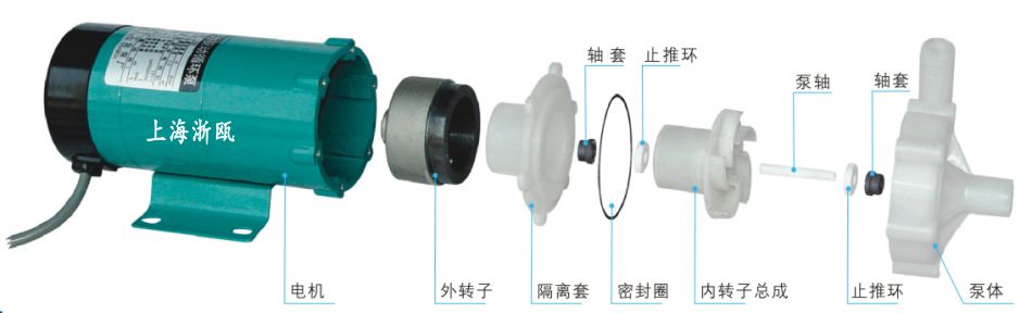 部 件 1、固定螺絲及墊圈 2、泵殼 3、泵軸 4、葉輪 5、被動磁鐵 6、密封圈 7、隔離套 8、主動磁鐵 9、電機 |