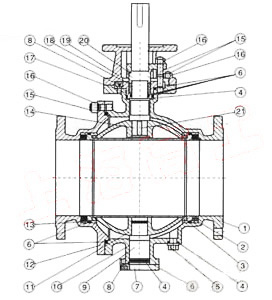 本閥有二塊式和三塊式兩種閥體結(jié)構(gòu),中法蘭用螺栓連接,密封采用增強(qiáng)聚四氟乙烯鑲?cè)氩讳P鋼圈內(nèi),鋼圈后部沒(méi)有彈簧保證閥座緊貼球體,保持密封。上下閥桿均沒(méi)有PTFE軸承,減少磨擦,操作省力,小軸底部沒(méi)有調(diào)整片,保證球與密封圈的接處位置。全通徑:閥門(mén)流量孔徑與管線內(nèi)徑一致,以便管線清掃。