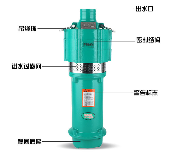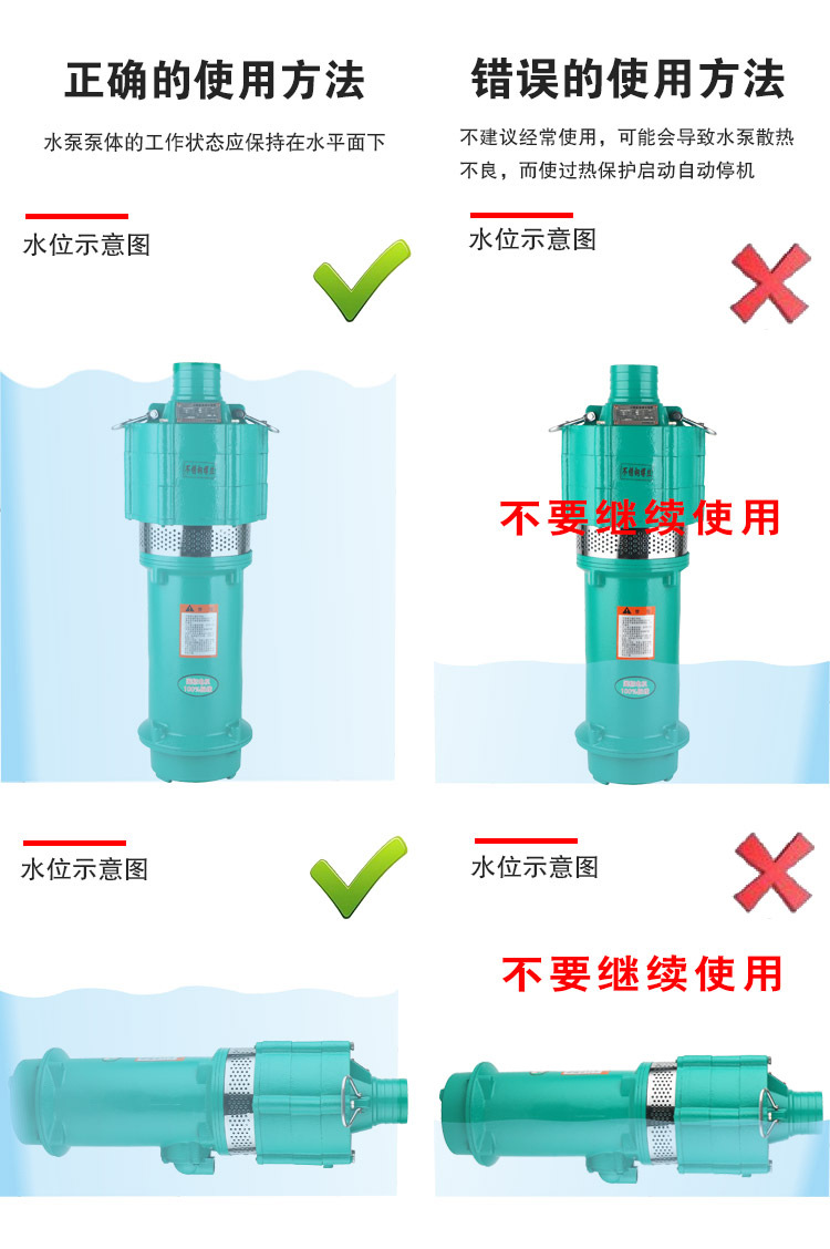 3、電泵應(yīng)額定揚(yáng)程附近的使用范圍內(nèi)使用。并且完全浸入水中使用,潛水深度不大于5m.