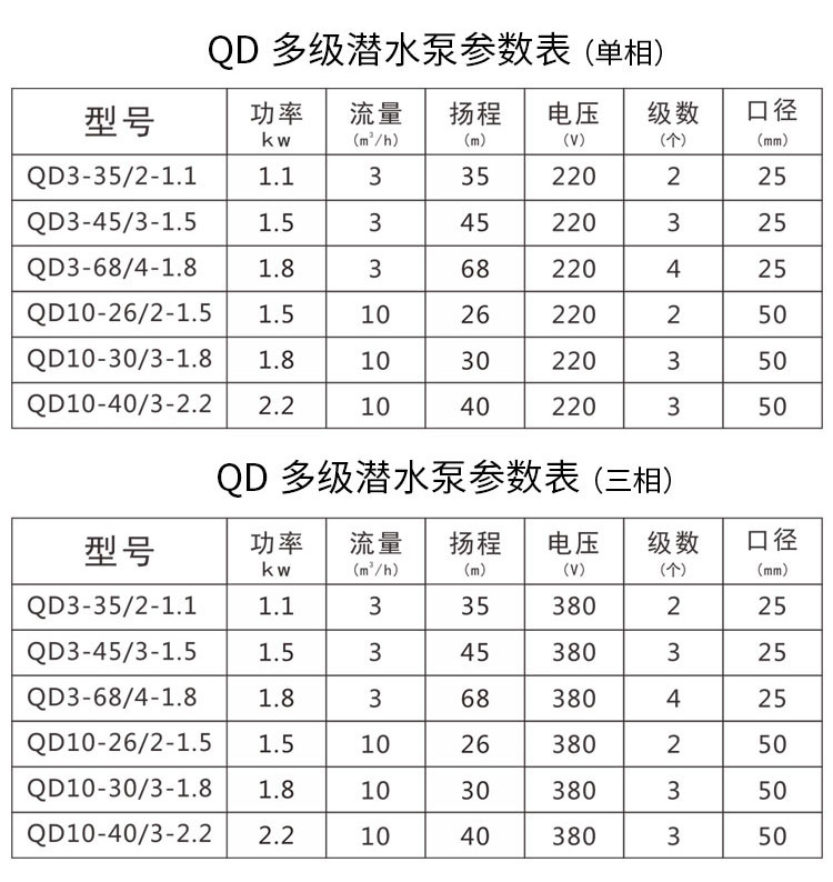 QD高揚(yáng)程多級(jí)潛水泵性能參數(shù):