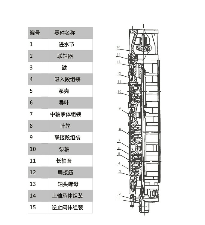 2、潛水泵為單吸多級立式離心泵;潛水電機(jī)為充水濕式、立式井用潛水異步電動機(jī)。電機(jī)與水泵通過筒式聯(lián)軸器直聯(lián)。