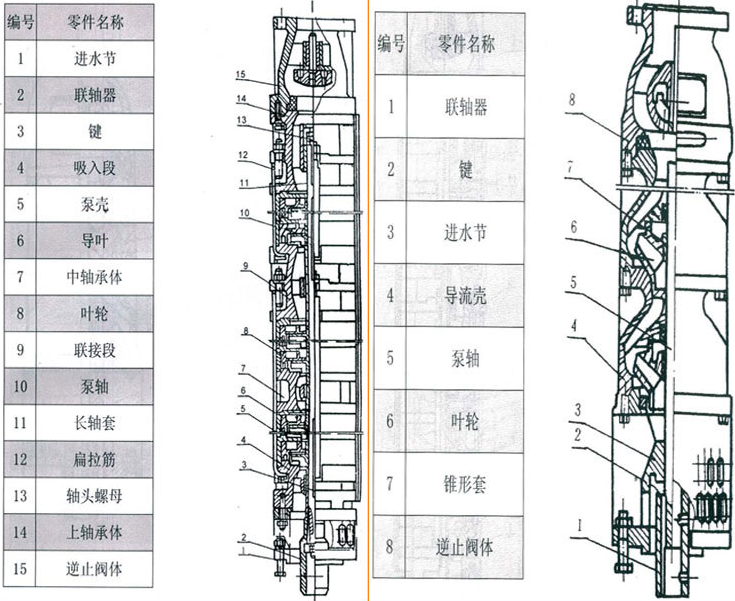 QJ型潛水泵由多級(jí)離心式葉輪分段串聯(lián)組成。泵級(jí)間由扁拉筋或螺栓連接,每段之間由橡膠(或銅)軸承支撐,泵的頂端沒有逆止閥。YQS型潛水電機(jī)為密閉充水式三相異步電機(jī),繞組采用耐水連續(xù)密封結(jié)構(gòu),導(dǎo)軸承和推力軸承均為水潤滑軸承;電機(jī)上部安裝有防砂機(jī)構(gòu),阻止泥沙進(jìn)入電機(jī)內(nèi)控。