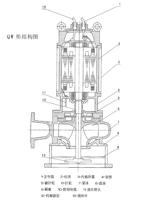 可根據(jù)用戶需要配備全自動安全保護(hù)控制柜,對泵的漏水,漏電,過載及超溫等進(jìn)行監(jiān)控,保證泵運行可靠安全。雙導(dǎo)軌自動耦合安裝系統(tǒng),給泵的安裝的安裝,維修帶來了極大的方便,人可不必為此而進(jìn)出污水坑。浮球開關(guān)可根據(jù)所需的水位變化。自動控制泵的停啟,無需專人看管。在使用揚(yáng)程范圍內(nèi)保證電機(jī)運行不過載。根據(jù)使用場合電機(jī)可采用水套式外第三者循環(huán)冷卻系統(tǒng),能保證電泵在無水(干式)狀態(tài)下安全運行。安裝方式有固定式自動耦合安裝和移動式自由安裝二種,可滿足不同的使用場合。結(jié)構(gòu)說明 QW型無堵塞潛水排污泵由電機(jī)與泵兩部分組成,二者通過油隔離室及機(jī)械密封組件隔開,屬機(jī)電一體化產(chǎn)品,電機(jī)與泵合用同一軸(轉(zhuǎn)子)整個水泵長度短,結(jié)構(gòu)緊湊。
