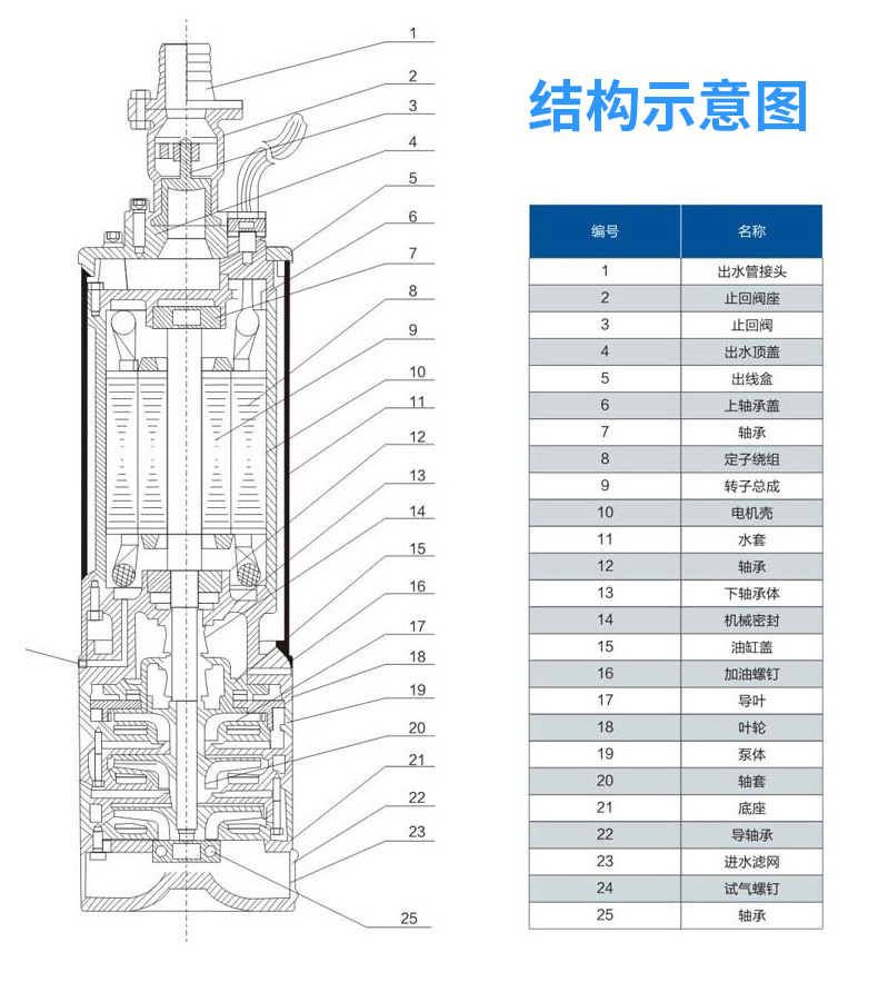 QX內(nèi)裝式潛水電泵由水泵、密封、電動(dòng)機(jī)、冷卻水套組成,電動(dòng)機(jī)位于電泵上部為三相異步電動(dòng)機(jī)結(jié)構(gòu),水泵位于電泵下部,為多級離心式葉輪徑向?qū)~結(jié)構(gòu),具有揚(yáng)程高外形小的特點(diǎn),水泵與電機(jī)之間采用兩道獨(dú)立的機(jī)械密封,各固定止口密封處采用“O”形耐油橡膠密封圈作靜密封,電動(dòng)機(jī)外套有鋼制冷卻水套,電泵工作時(shí),水流從水套和電動(dòng)機(jī)之間空隙通過,對電動(dòng)機(jī)和軸承有良好的冷卻作用,因此電泵上部可以露出水面工作。電泵轉(zhuǎn)軸經(jīng)鍍鉻處理,不易嗎磨損、腐蝕,切便于葉輪的維修和拆卸。11KW以下電機(jī)內(nèi)特配有圓盤式保護(hù)裝置,能在機(jī)內(nèi)溫度過高,過載,缺相,等異常情況下,切斷電壓保護(hù)電機(jī)。