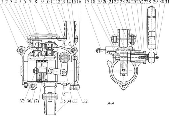 連桿(36)等傳動機(jī)構(gòu),使活塞(7)作往復(fù)運(yùn)動。如圖所示,當(dāng)活塞向左移動時,右端的泵缸體積逐漸擴(kuò)大,形成真空,液體從吸水管(34)經(jīng)過鑄在泵體旁邊的吸入流道頂開吸水閥進(jìn)入缸體右端。在同一時間里,缸體左側(cè)由于活塞的壓縮,使壓水閥(5)頂開,液體經(jīng)吐出管(11)排出。若活塞的運(yùn)動方向返回向右時,則泵缸左側(cè)吸入液體,泵缸右側(cè)排出液體,這樣往復(fù)不歇地把液體吸入排出。形成泵的工作。泵的壓水閥向上行程由蓋板(6)限止,吸水閥向上行程由壓水閥限止。蓋板與泵體用螺栓(8)緊固,活塞行程由泵蓋(14)和泵體限止。