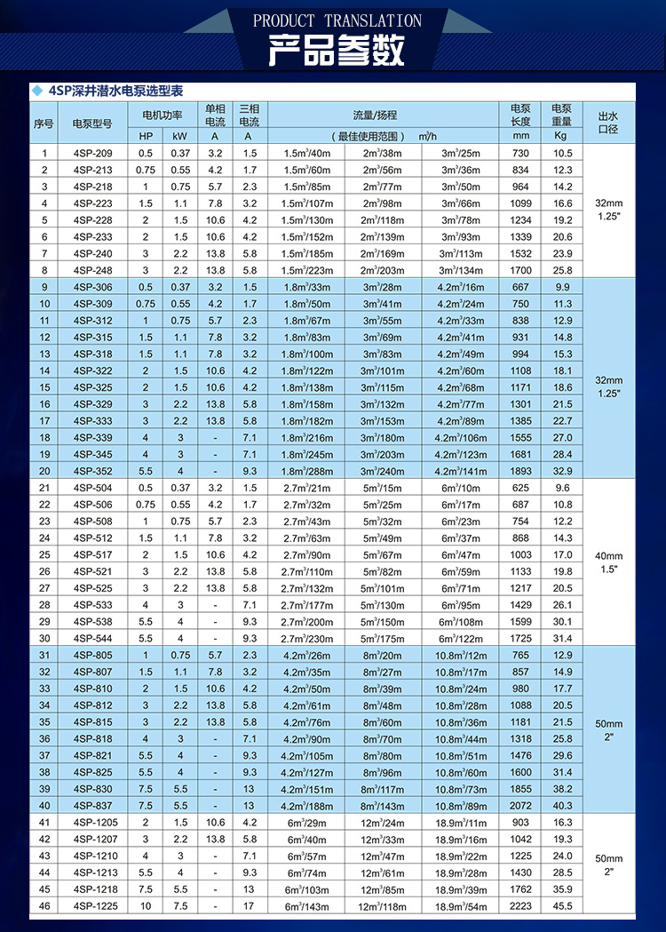 SP不銹鋼多級深井潛水電泵性能參數(shù):