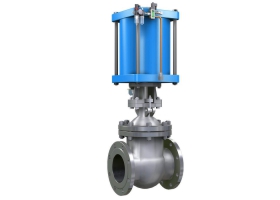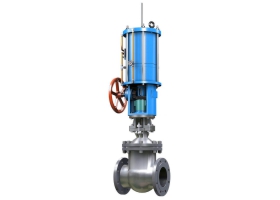 1、 本閥主要由閥體、閥蓋、閘板、閥桿、密封圈、雙層氣缸及其活塞、活塞桿、隔板連同緩沖機(jī)構(gòu)、手動(dòng)機(jī)構(gòu)、氣動(dòng)-手動(dòng)轉(zhuǎn)換裝置和閥蓋填料裝置等部分組成。