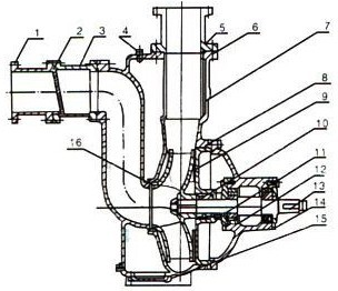 ZW型自吸式無堵塞排污泵,主要由泵體, 葉輪、后蓋、機械密封、泵軸、軸承座、進口閥、氣液分離管、加水閥門、進、排接管等組成。泵的結(jié)構(gòu)見圖。ZW型自吸排污泵的工作原理:泵體內(nèi)設(shè)有儲液腔,并通過上方的回流孔和下方的循環(huán)孔與泵工作腔相通,構(gòu)成泵的軸向加流外混式系統(tǒng)。泵停止工作后,泵內(nèi)腔已儲有一定容積的液體。當(dāng)泵起動時,有關(guān)當(dāng)局內(nèi)的儲液在葉輪的作用下,夾帶著空氣被向上拋出,液體通過氣液分離管的網(wǎng)格回流到工作腔,氣體被排出泵外,使泵內(nèi)形成一定的真空度,達到自吸的作用。