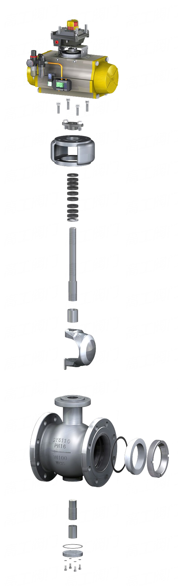 過齒輪,齒條傳動(dòng)。直至氣信號(hào)壓力形成的推力與彈簧力平衡,運(yùn)動(dòng)停止。在執(zhí)行機(jī)構(gòu)主軸作旋轉(zhuǎn)運(yùn)動(dòng)的同時(shí)帶動(dòng)閥桿、閥芯作旋轉(zhuǎn)運(yùn)動(dòng),從而改變閥芯、閥座之間